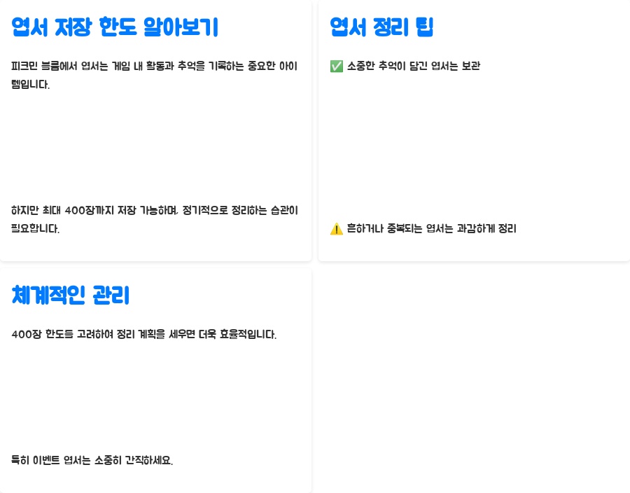 피크민 블룸에서 엽서는 여러분의 게임 내 활동과 추억을 기록하는 귀중한 아이템입니다. 하지만 무한정 저장할 수는 없다는 사실! 최대 400장까지 저장할 수 있으니, 정기적으로 엽서를 정리하는 습관을 들이는 것이 좋습니다.