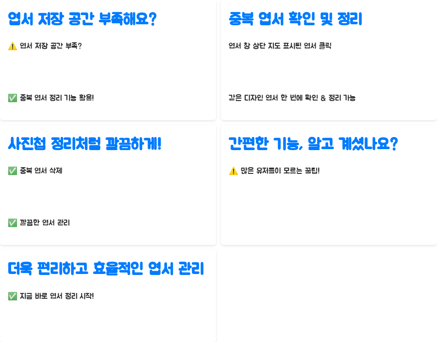 마치 사진첩을 정리하는 것처럼, 중복된 엽서들을 골라서 삭제하면 훨씬 깔끔하게 엽서를 관리할 수 있어요. 정리 기능을 사용하는 방법은 매우 간단하지만, 많은 유저들이 이 기능을 모르고 있다는 사실!
