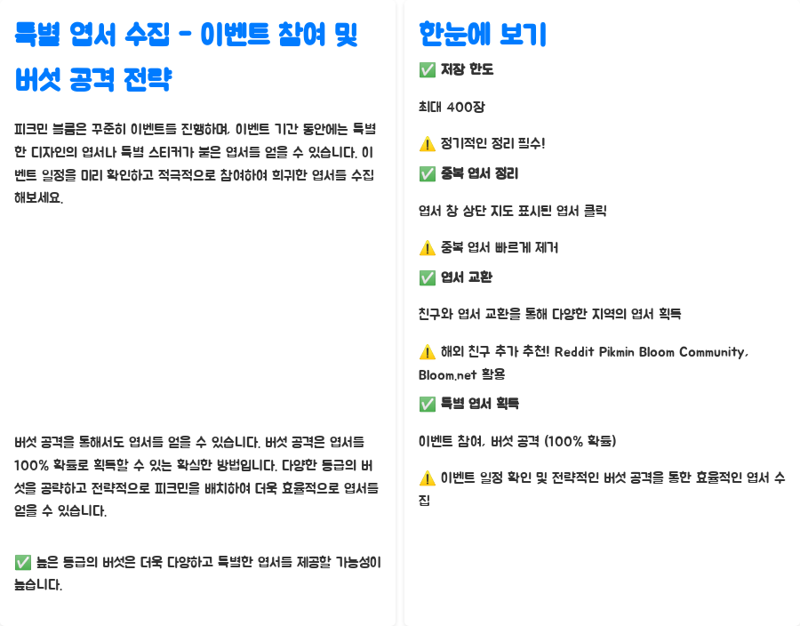 피크민 블룸은 꾸준히 이벤트를 진행하며, 이벤트 기간 동안에는 특별한 디자인의 엽서나 특별 스티커가 붙은 엽서를 얻을 수 있습니다. 이벤트 일정을 미리 확인하고 적극적으로 참여하여 희귀한 엽서를 수집해보세요.