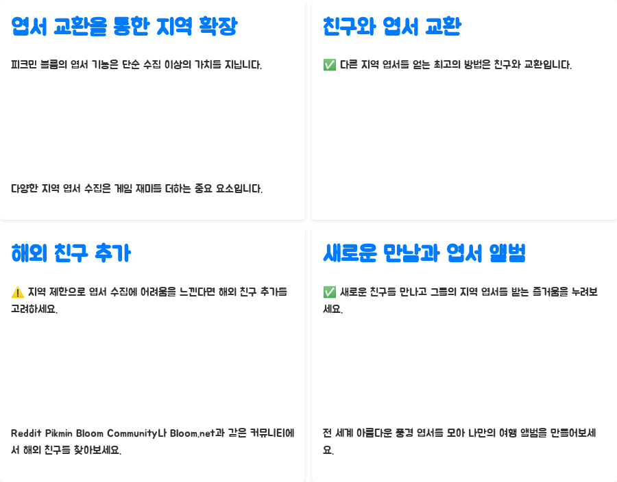 피크민 블룸의 엽서 기능은 단순히 수집만으로 끝나는 것이 아닙니다. 다양한 지역의 엽서를 수집하는 것은 게임의 재미를 배가시키는 중요한 요소입니다. 특히, 다른 지역의 엽서를 얻는 가장 좋은 방법은 친구를 통해 엽서를 교환하는 것입니다.