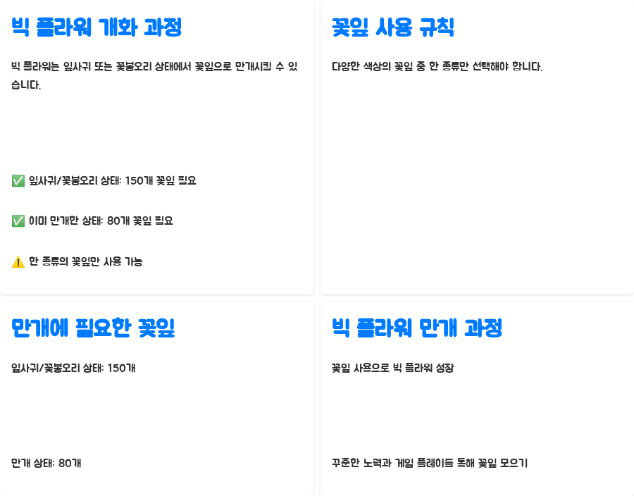 참고: 위 표는 일반적인 경향을 보여주는 것이며, 실제 빅 플라워의 종류는 주변 환경과 심어진 꽃의 종류에 따라 다를 수 있습니다. 항상 주변을 살피고, 다양한 종류의 꽃을 심어보는 것을 추천합니다! 게임 내 이벤트에 따라 특정 꽃의 등장 확률이 높아지는 경우도 있습니다. 이벤트 기간 동안에는 원하는 꽃을 더욱 쉽게 만날 수 있습니다.