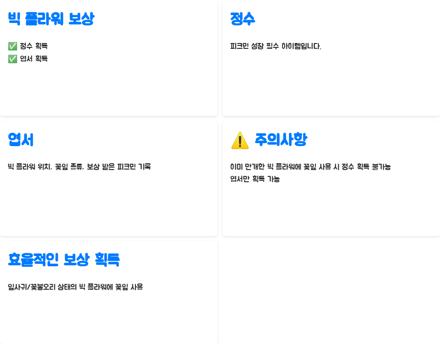 빅 플라워를 만개시키면 푸짐한 보상이 기다리고 있습니다. 바로 정수와 엽서입니다! 싱그러운 꽃향기와 함께 여러분의 게임 내 화분에 활력을 불어넣어 줄 정수는 피크민을 성장시키는 데 필수적인 아이템입니다. 또한 빅 플라워에서 얻을 수 있는 엽서는 게임 내 추억을 기록하는 아름다운 수집품이기도 하죠. 엽서에는 빅 플라워의 위치, 꽃잎 종류, 그리고 보상을 받은 피크민이 기록되어 있어, 특별한 순간들을 영원히 간직할 수 있습니다.