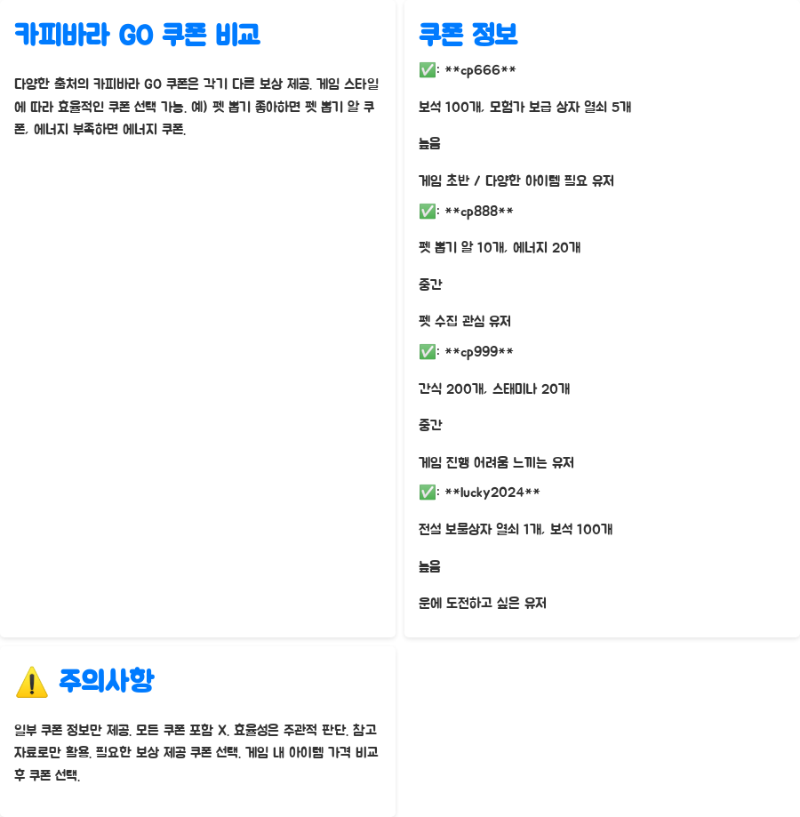다양한 출처에서 얻을 수 있는 카피바라 GO 쿠폰은 각각 다른 보상을 제공합니다. 어떤 쿠폰이 더 효율적인지는 여러분의 게임 플레이 스타일에 따라 다를 수 있습니다. 예를 들어, 펫 뽑기에 관심이 많다면 펫 뽑기 알을 제공하는 쿠폰을 우선적으로 사용하는 것이 좋습니다. 반면, 게임 진행에 필요한 에너지나 스태미나가 부족하다면, 해당 아이템을 제공하는 쿠폰을 사용하는 것이 더 효율적일 것입니다. 아래 표는 일부 쿠폰의 보상을 비교하여 쿠폰 선택에 도움을 드리고자 정리한 것입니다.