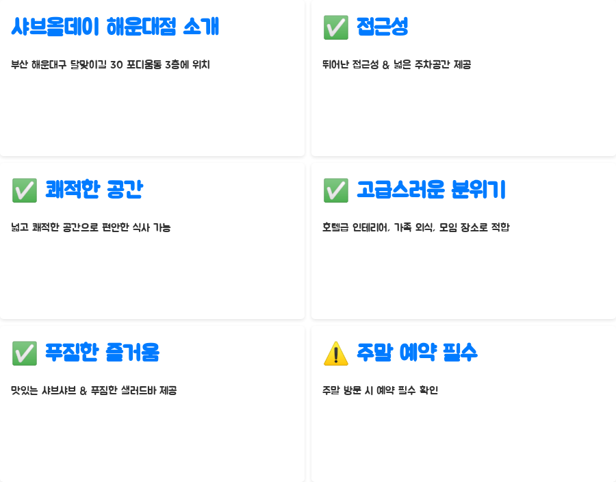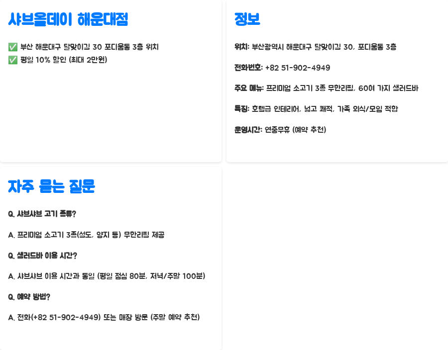 오늘 알아본 내용 어떠셨나요? 부산 해운대에서 프리미엄 샤브샤브 뷔페를 즐기고 싶다면 샤브올데이 해운대점을 꼭 방문해 보세요! 다음 포스팅에서는 또 다른 맛집을 소개할 테니, 저희 블로그 구독과 다른 게시글 방문도 부탁드립니다!