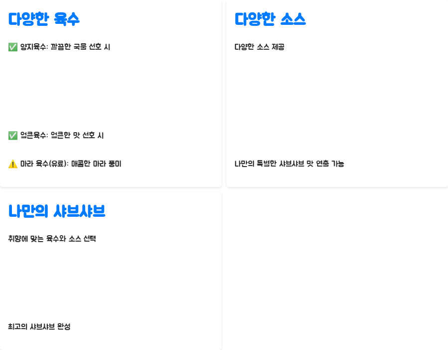 취향대로 육수와 소스를 선택하여 나만의 최고의 샤브샤브를 완성해 보세요. 이러한 다양한 선택지는 샤브올데이 해운대점만의 특별한 경험을 선사합니다.