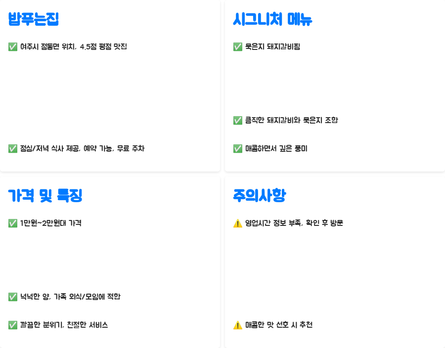 | 밥푸는집 | 경기 여주시 점동면 쳐리 583-6 | 묵은지 돼지갈비찜 전문, 예약 가능, 무료 주차 | ₩10,000-20,000 |