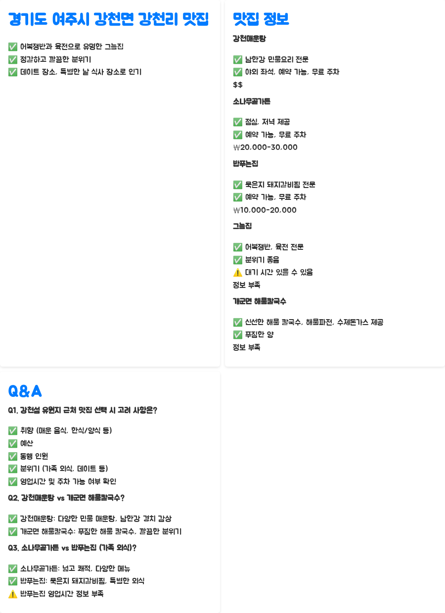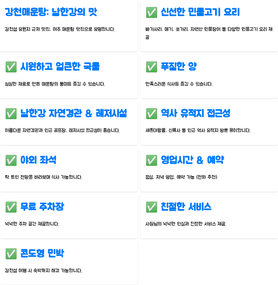| 강천매운탕 | 경기 여주시 강천면 강천리 601-5 | 남한강 민물요리 전문, 야외 좌석, 예약 가능, 무료 주차 | $$ |