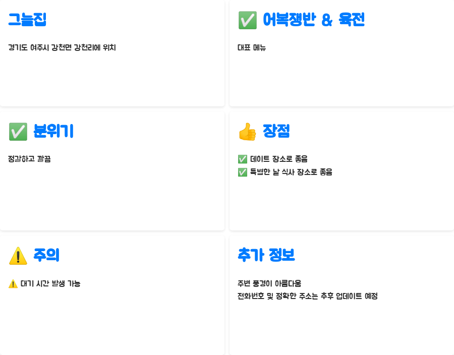 | 그늘집 | 경기 여주시 강천면 강천리 | 어복쟁반, 육전 전문, 분위기 좋음, 대기 시간 있을 수 있음 | 정보 부족 |