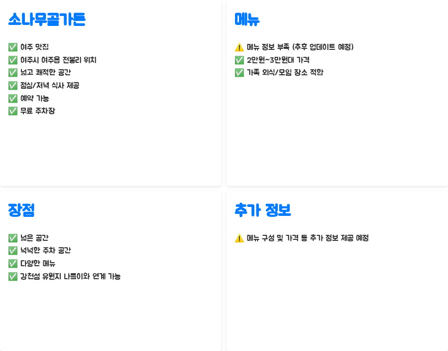 | 소나무골가든 | 경기 여주시 여주읍 전봉리 | 점심, 저녁 제공, 예약 가능, 무료 주차 | ₩20,000-30,000 |