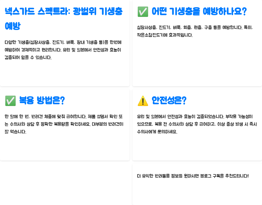 | 넥스가드 스펙트라 | 심장사상충 및 내외부 기생충 예방, 한 달에 한 번 복용, 높은 기호성, 유럽/일본 안전성 입증 | 간편한 복용, 광범위한 기생충 예방, 높은 기호성, 안전성 및 효능 검증 완료 | 가격이 다소 높을 수 있음 |