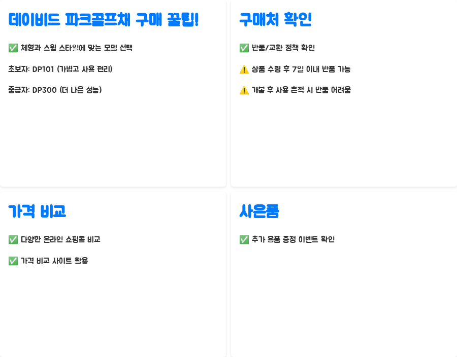데이비드 파크골프채를 구매하기 전, 몇 가지 팁을 알려드리겠습니다. 먼저, 본인의 체형과 스윙 스타일에 맞는 모델을 신중하게 선택하는 것이 중요합니다.