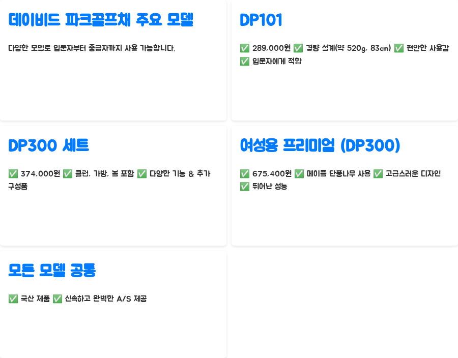 여기에 고급스러운 디자인과 더욱 향상된 기능을 원하는 여성 유저를 위한 여성용 프리미엄 파크골프채(DP300 모델)도 있습니다. 가격은 약 675,400원으로 다소 높지만, 메이플 단풍나무를 사용한 고급스러운 디자인과 뛰어난 성능은 그 값어치를 충분히 합니다.