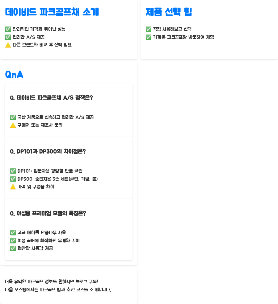 오늘 알아본 내용 어떠셨나요? 데이비드 파크골프채에 대한 궁금증이 조금이나마 해소되셨기를 바랍니다! 더욱 유익한 파크골프 정보를 원하신다면, 저희 블로그를 구독해주세요. 다음 포스팅에서는 파크골프 팁과 추천 코스를 소개할 예정입니다. 많은 관심과 기대 부탁드립니다!