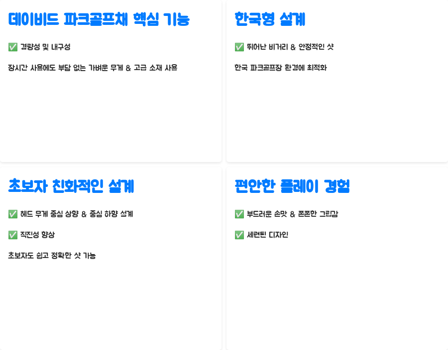 특히 한국 파크골프장의 환경에 맞춰 설계되어, 뛰어난 비거리와 안정적인 샷을 기대할 수 있습니다. 초보자도 쉽게 사용할 수 있도록 설계된 점 또한 주목할 만한데요.