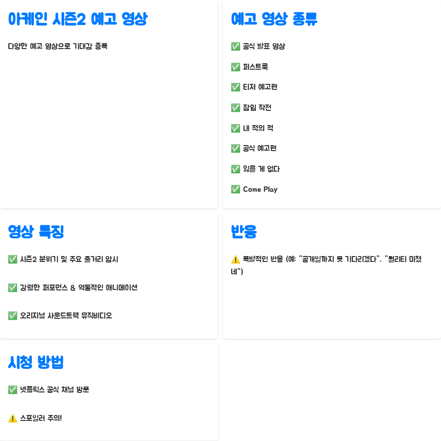 오늘 알아본 내용 어떠셨나요? <아케인> 시즌2 출시일과 함께, 흥미진진한 스토리와 다양한 정보들을 함께 나눌 수 있어서 저도 기뻤습니다! 이 글이 여러분의 기다림을 조금이나마 달래주었기를 바라며, 다음에도 더욱 유익하고 재미있는 콘텐츠로 찾아뵙겠습니다. 다른 재밌는 애니메이션 이야기가 궁금하다면, 블로그 구독을 통해 새로운 소식을 가장 먼저 받아보세요!