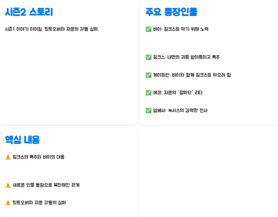 | 주요 스토리 | 필트오버와 자운의 갈등 심화, 바이와 징크스 자매의 갈등 |