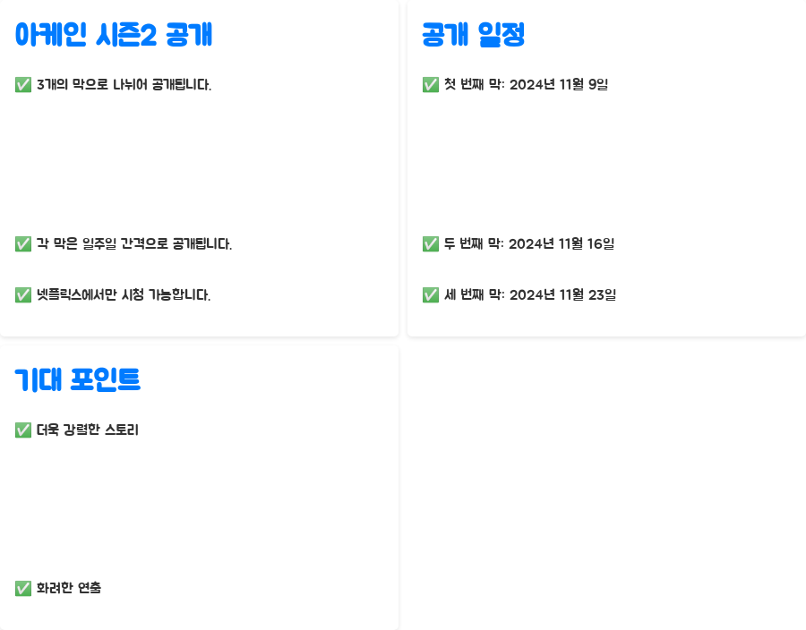 | 시즌2 공개 방식 | 3개의 막으로 나뉘어 순차적으로 공개 (11월 9일, 16일, 23일) |