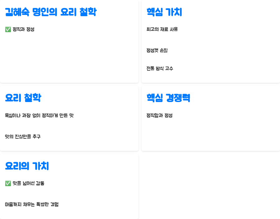 A. 김혜숙 명인의 요리 철학은 '정직'과 '정성'입니다. 항상 최고의 재료를 사용하고, 전통 방식을 고수하며, 정성껏 요리하는 것을 중요하게 생각합니다. 그녀의 요리에는 욕심이나 과장이 없고, 오로지 정직하게 만들어진 맛의 진실만이 담겨 있습니다.