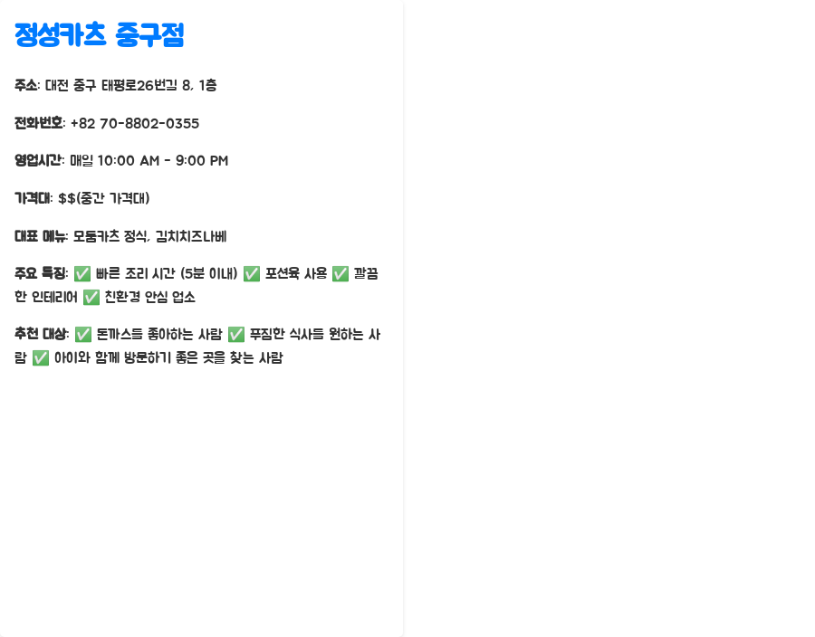 정성카츠 중구점은 맛있는 돈까스를 빠르고 간편하게 즐기고 싶은 분들에게 추천합니다. 푸짐한 양과 다양한 메뉴는 남녀노소 누구나 만족시킬 수 있는 장점입니다. 또한, 깔끔한 매장 분위기와 친절한 서비스는 식사를 더욱 즐겁게 만들어줍니다. 특히, 아이와 함께 방문하기 좋은 곳을 찾는 분들에게도 적합합니다. 대전 돈까스 맛집, 정성카츠는 혼밥, 가족 외식, 친구와의 식사 등 다양한 상황에 적합하며, 빠르고 맛있는 식사를 원하는 모든 분들에게 만족을 선사할 것입니다.