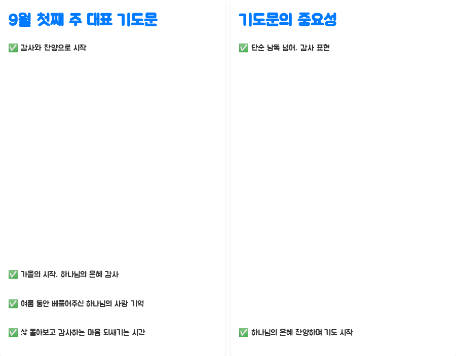 가을이 성큼 다가온 9월, 싱그러운 바람과 함께 마음도 새로워지는 계절입니다. 특히나 주일 예배는 한 주간의 시작을 긍정적인 에너지로 채우고, 하나님과 더욱 가까워지는 소중한 시간이죠. 이번 9월 첫째 주 주일 예배에는 어떤 마음으로 하나님께 기도를 드려야 할까요? 9월 첫째 주 대표 기도문을 통해 감사와 회개, 그리고 소망을 담은 기도를 배우고, 우리의 신앙을 더욱 깊이 성장시키는 시간을 가져보세요.
