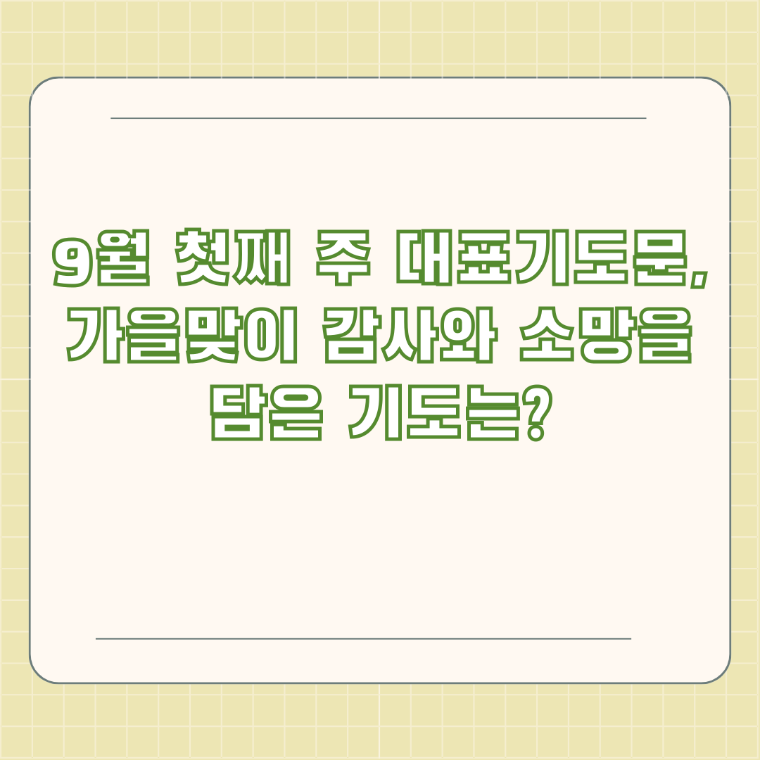 오늘 알아본 내용 어떠셨나요? 9월 첫째 주 대표 기도문을 통해 우리는 하나님께 감사하고, 우리의 부족함을 회개하며, 교회와 나라 그리고 우리 삶을 위해 기도하는 법을 배웠습니다. 이 글이 여러분의 신앙생활에 도움이 되셨으면 좋겠네요!