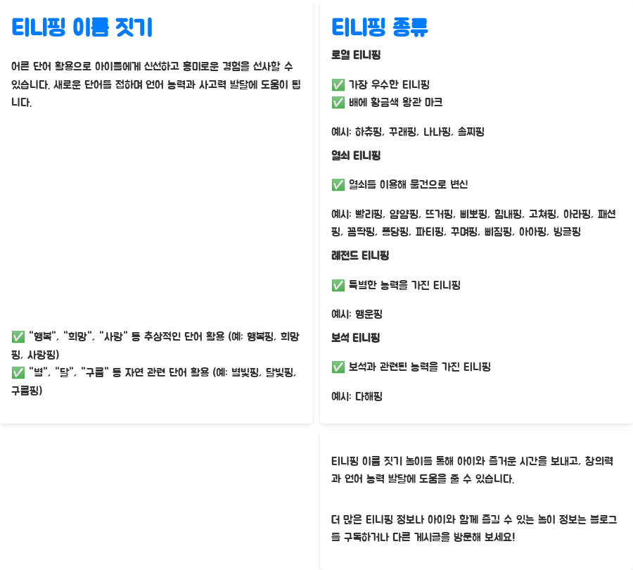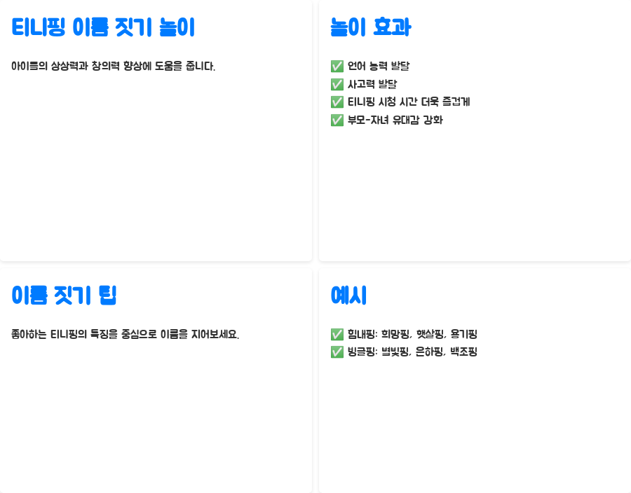 티니핑 이름 짓기 놀이는 아이들의 상상력과 창의력을 키워주는 데 효과적인 놀이입니다. 아이들은 좋아하는 티니핑의 특징이나 성격을 바탕으로 새로운 이름을 지어보면서, 자연스럽게 언어 능력과 사고력을 발달시킬 수 있죠. 티니핑 이름 짓기 놀이는 아이와 함께 티니핑을 보는 시간을 더욱 즐겁고 유익하게 만들어 줄 뿐만 아니라, 부모와 자녀 간의 유대감을 강화하는 데에도 도움을 줄 수 있습니다.