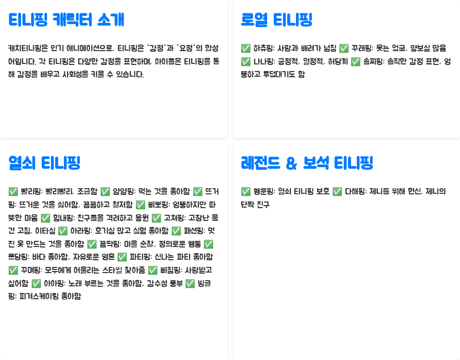 요즘 아이들 사이에서 폭발적인 인기를 얻고 있는 캐치티니핑! 사랑스러운 티니핑 캐릭터들은 아이들의 마음을 사로잡았을 뿐만 아니라, 부모님들에게도 익숙한 존재가 되었죠. 하지만 다양한 티니핑 캐릭터들의 이름을 모두 기억하기란 쉽지 않아, 아이와 함께 티니핑을 보다 보면 "엄마, 이 티니핑 이름이 뭐였지?" 하는 난감한 순간이 찾아오기도 합니다. 혹시 아이와 함께 티니핑을 보며 티니핑 이름 외우기에 어려움을 겪고 계신가요? 혹은 티니핑 이름 짓기 놀이를 통해 아이의 창의력을 키워주고 싶은 마음이 드시나요? 걱정 마세요! 오늘은 캐치티니핑 캐릭터들을 좀 더 깊이 알아보고, 아이와 함께 즐거운 티니핑 이름 짓기 놀이를 할 수 있는 다양한 방법들을 소개해 드릴게요.