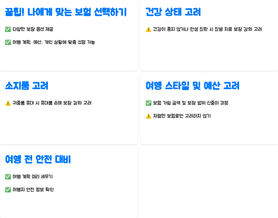 | 보험료 | 가입 나이, 성별, 여행 기간, 담보 가입 여부에 따라 달라짐 |