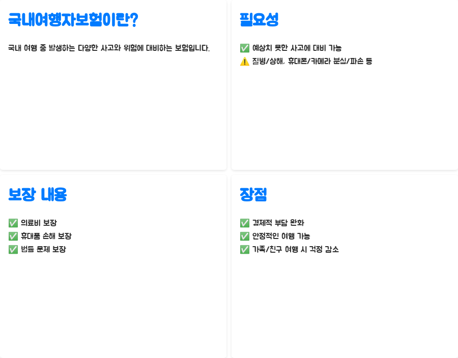 국내여행자보험은 말 그대로 국내 여행 중 발생할 수 있는 다양한 사고와 위험에 대비하기 위한 보험 상품입니다. 국내여행 중 발생하는 예상치 못한 사고는 언제든 일어날 수 있기 때문에 미리 대비하는 것이 중요합니다. 혹시 여행 중 갑작스러운 질병이나 상해로 인해 병원에 가야 할 상황이 발생하거나, 소중한 휴대폰이나 카메라를 분실하거나 파손하는 일이 발생할 수도 있죠. 이럴 때 국내여행자보험은 의료비, 휴대품 손해, 그리고 법률적인 문제까지 다양한 부분에서 보장을 제공하며, 갑작스러운 상황 속에서도 경제적 부담을 줄여주고 안정적인 여행을 돕는 역할을 합니다. 특히, 가족 여행이나 친구들과 함께 떠나는 여행에서 예상 못한 일이 발생하면 더욱 난감해질 수 있는데, 이러한 걱정을 덜어주는 것이 바로 국내여행자보험의 가장 큰 장점입니다.
