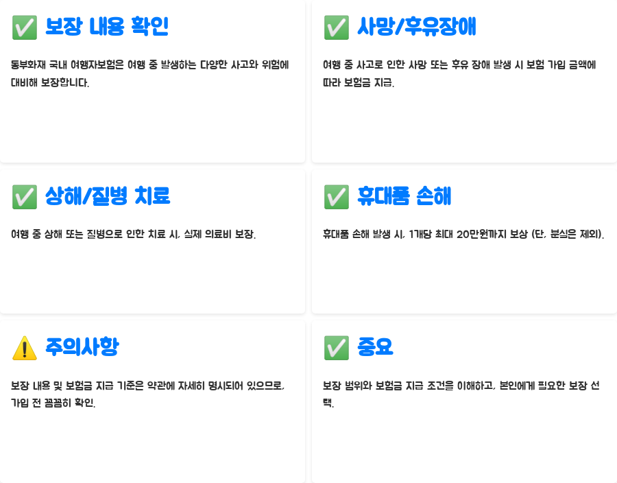 오늘 알아본 내용 어떠셨나요? 동부화재 국내 여행자보험은 국내 여행 중 발생할 수 있는 다양한 위험으로부터 안전을 지켜주는 든든한 파트너가 될 수 있습니다. 이 글이 여러분의 안전하고 즐거운 여행 계획에 도움이 되셨으면 좋겠네요!
