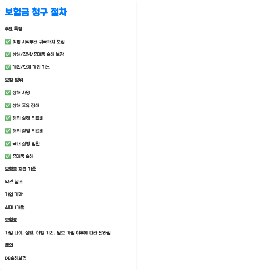 | 주요 특징 | 여행 시작부터 귀국까지 보장, 상해/질병/휴대품 손해 보장, 개인/단체 가입 가능 |