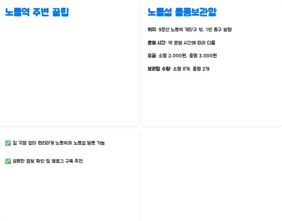 노들역은 9호선 노선을 이용할 수 있으며, 인근에는 버스 정류장도 있어 대중교통 이용이 편리합니다. 노들역 주변에는 편의점, 카페, 식당 등 다양한 편의시설이 있어 짐을 맡기고 편리하게 이용하실 수 있습니다. 특히 노들섬과 가까워, 짐을 맡기고 노들섬을 방문하기 좋은 환경을 갖추고 있습니다. 노들역에서 노들섬까지는 도보로 약 10분 정도 소요됩니다. 노들섬에서 다양한 문화 공연 및 행사도 진행되므로, 노들역을 방문하시기 전에 노들섬 공식 웹사이트를 참고하여 행사 일정을 확인해보는 것도 좋습니다.