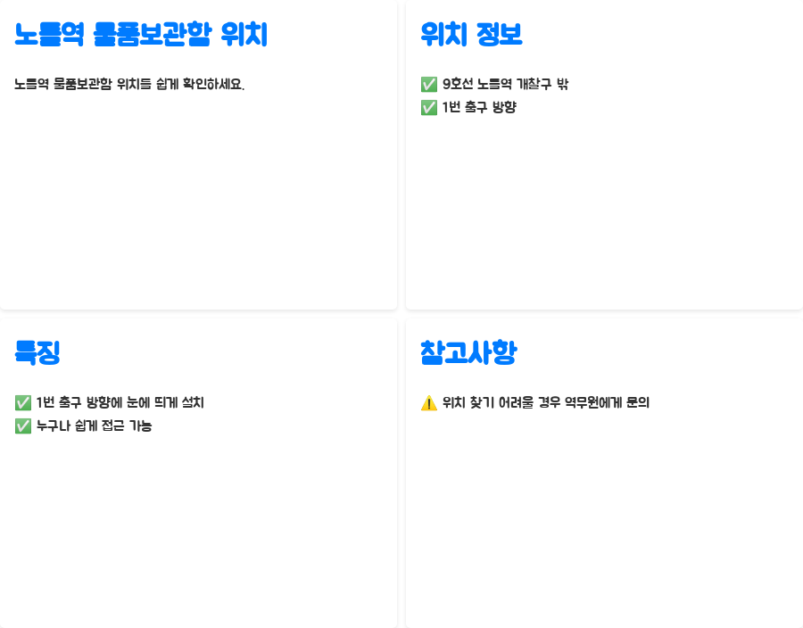노들역 물품보관함은 어디에 있을까요? 혹시 역 내부를 헤매고 다니며 찾느라 시간을 낭비하고 싶지 않으시다면, 미리 위치를 확인하는 것이 좋겠죠? 노들역 물품보관함은 9호선 노들역 개찰구 밖, 1번 출구 방향에 위치하고 있습니다. 1번 출구로 나가는 길목에 눈에 띄게 설치되어 있기 때문에 쉽게 찾으실 수 있을 거예요. 서울 지하철 9호선 노들역을 이용하시는 분이라면, 누구나 쉽게 접근 가능한 곳에 위치해 있어 편리하게 이용하실 수 있다는 장점이 있습니다. 혹시라도 위치를 찾는 데 어려움을 느끼신다면 역무원에게 문의하시면 친절하게 안내해드릴 거예요.