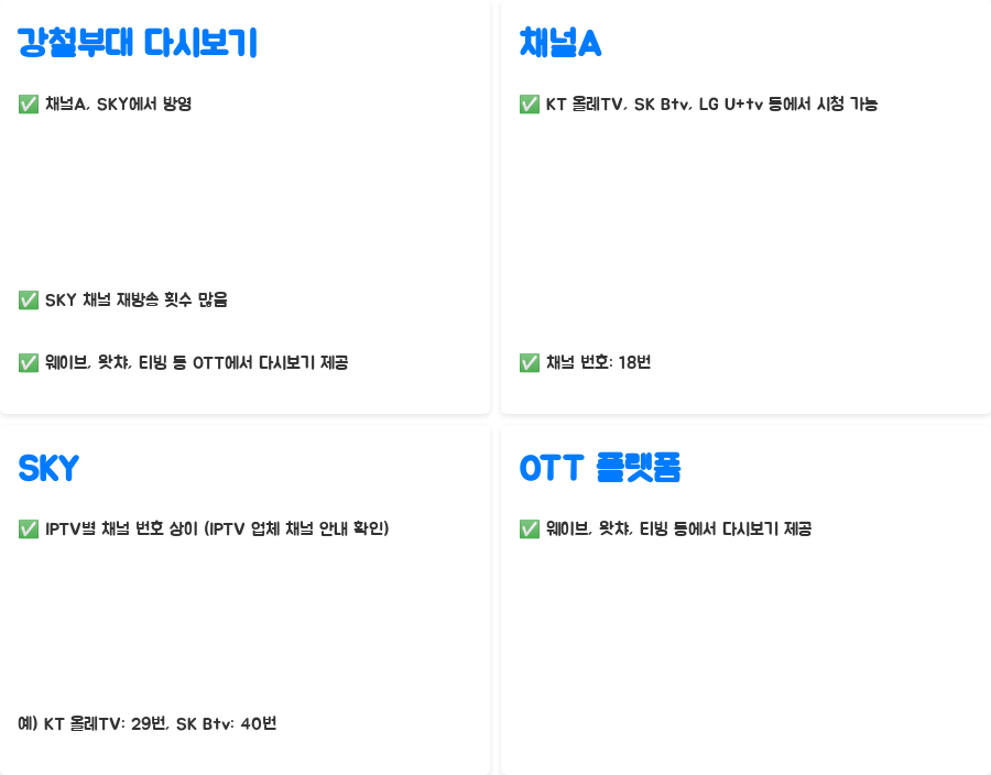 강철부대는 채널A와 SKY에서 방영된 프로그램으로, 재방송 역시 주로 이 두 채널에서 시청 가능합니다. 특히 SKY 채널에서는 재방송 편성 횟수가 많은 편이니 참고하시면 좋겠죠! 또한, 웨이브, 왓챠, 티빙과 같은 OTT 플랫폼에서도 다시보기 서비스를 제공하고 있어, 언제 어디서든 편리하게 시청할 수 있다는 장점이 있습니다. IPTV 이용자라면 각 통신사별 채널 번호를 확인하여 채널A와 SKY 채널을 찾아보시면 됩니다.