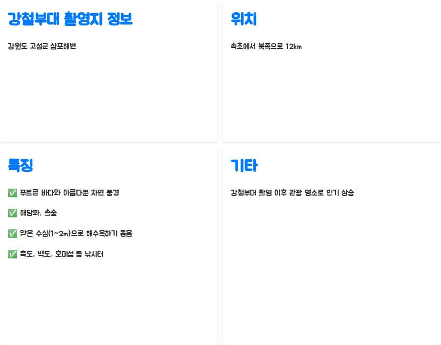 강철부대 촬영지는 강원도 고성군에 위치한 삼포해변입니다. 푸르른 바다와 아름다운 자연 풍경이 돋보이는 곳이죠. 삼포해변은 속초에서 북쪽으로 12km 떨어진 곳에 위치하고 있으며, 해당화와 솔숲이 유명한 곳으로 알려져 있습니다. 바닷가는 깊이가 1~2m 정도로 얕아서 해수욕을 즐기기에도 안성맞춤이고, 흑도, 백도, 호미섬과 같은 아름다운 섬들이 있어 낚시터로도 인기가 높습니다. 강철부대 촬영을 통해 삼포해변의 아름다움이 더욱 널리 알려지게 되었고, 많은 사람들이 방문하는 관광 명소가 되었습니다. 강철부대를 보며 촬영지의 매력에 빠져들었다면, 직접 방문하여 아름다운 풍경을 감상해보는 건 어떨까요?