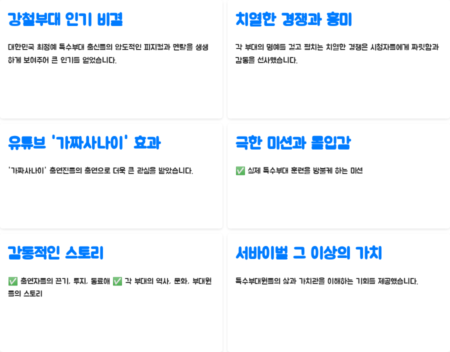 강철부대는 왜 이렇게 큰 인기를 얻었을까요? 그 이유는 바로 대한민국 최정예 특수부대 출신들의 압도적인 피지컬과 극한의 멘탈리티를 생생하게 보여주었기 때문입니다. 각 부대의 명예를 걸고 펼치는 치열한 경쟁은 시청자들에게 짜릿한 흥미와 감동을 선사했습니다. 특히 유튜브 '가짜사나이'를 통해 대중에게 알려진 특수부대원들이 강철부대에 출연하면서 더욱 큰 관심을 모았습니다.