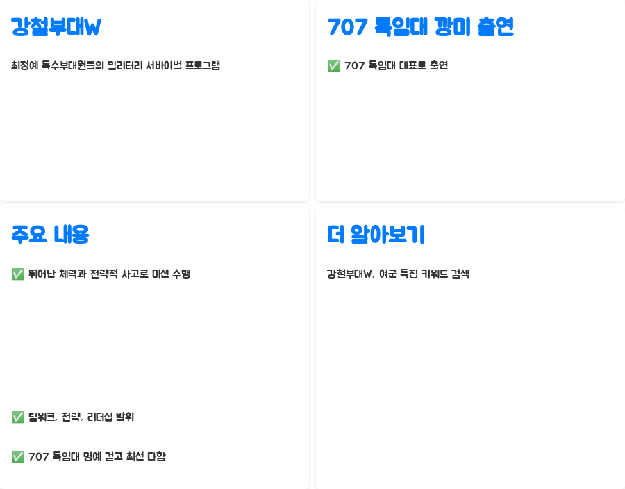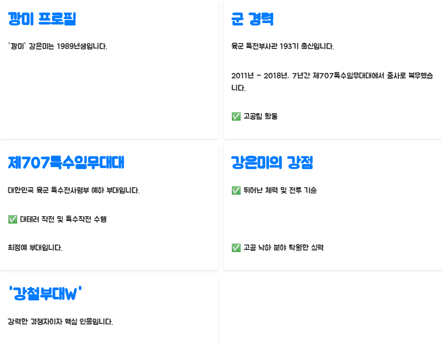 최정예 특전사 출신으로 유튜브에서 '깡레이더' 채널을 운영하며 인기를 얻고 있는 깡미! 최근 채널A의 밀리터리 서바이벌 프로그램 '강철부대W'에 출연하면서 더욱 많은 관심을 받고 있습니다. 707 특임대 출신다운 강인함과 넘치는 끼, 그리고 털털한 매력으로 시청자들을 사로잡고 있는 깡미는 과연 '강철부대W'에서 어떤 활약을 펼칠까요? 깡미에 대한 궁금증을 해소하고, '강철부대W'에서의 활약상까지 자세히 알아보는 시간을 가져보겠습니다.