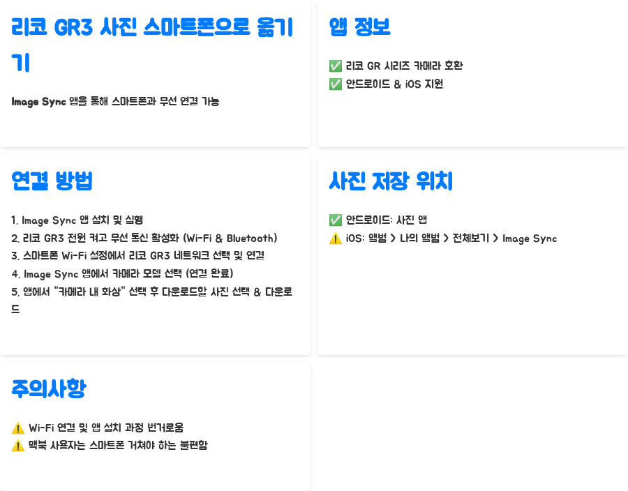 Image Sync 앱을 이용하면 리코 GR3의 사진을 편리하게 스마트폰으로 옮길 수 있지만, Wi-Fi 연결 및 앱 설치 과정이 다소 번거로울 수 있습니다. 특히, 맥북 사용자는 스마트폰을 중간 단계로 거쳐야 하는 불편함을 느낄 수 있습니다. 다음 팁에서 더욱 간편한 방법을 소개해 드리겠습니다.