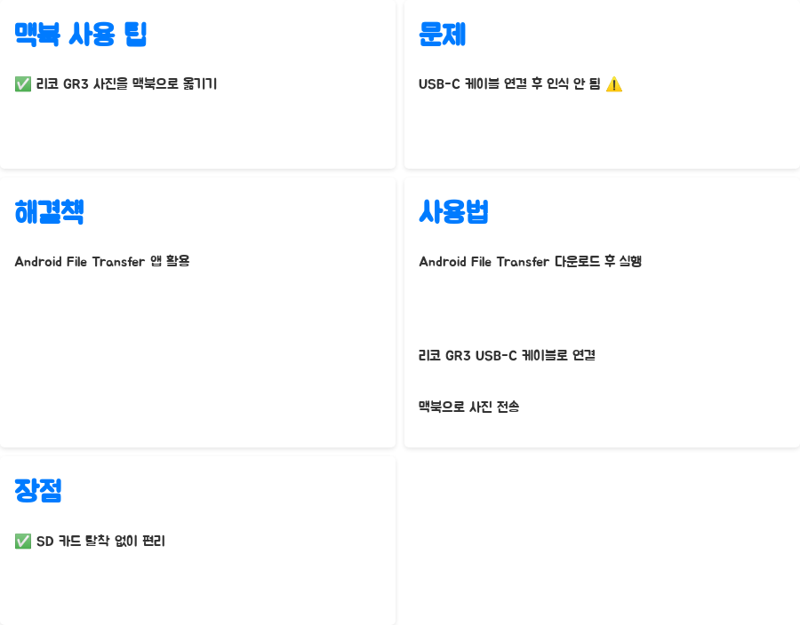 Android File Transfer를 다운로드하고 실행한 후, 리코 GR3를 맥북에 USB-C 케이블로 연결하면 리코 GR3의 내장 메모리에 있는 사진을 맥북으로 옮길 수 있습니다. 이 방법은 SD 카드를 꺼내지 않고도 맥북으로 사진을 전송할 수 있어 매우 편리합니다. 맥북 사용자라면 꼭 기억해 두세요!