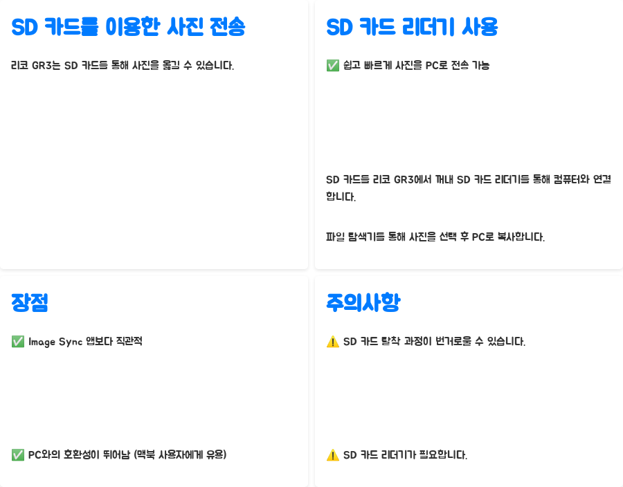 이 방법은 Image Sync 앱을 사용하는 것보다 더 직관적이고 빠릅니다. 특히, PC와의 호환성이 뛰어나 맥북 사용자에게도 유용합니다. 다만, SD 카드를 꺼내고 넣는 과정이 번거로울 수 있다는 점과, SD 카드 리더기가 필요하다는 점은 미리 참고하시면 좋습니다.
