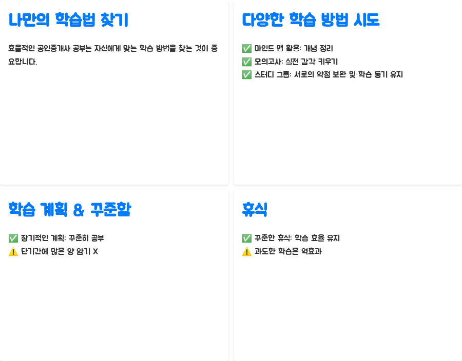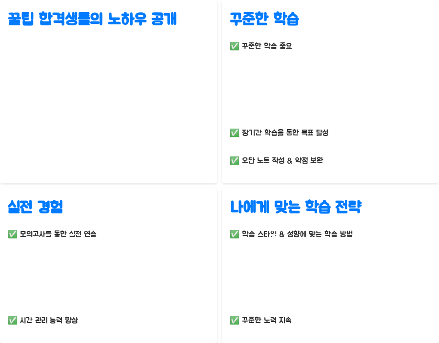 | 꿀팁 | 나에게 맞는 학습 방법 찾기, 스터디 그룹 활용, 학습 계획표, 충분한 휴식 |