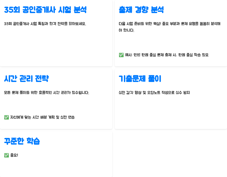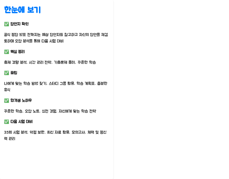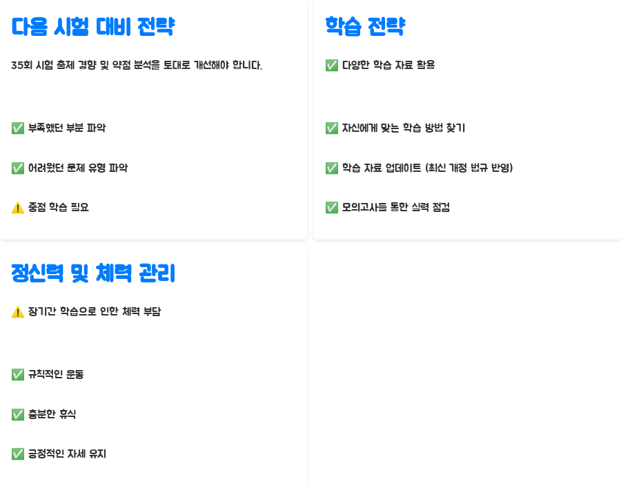 | 다음 시험 대비 | 35회 시험 분석, 약점 보완, 최신 자료 활용, 모의고사, 체력 및 정신력 관리 |