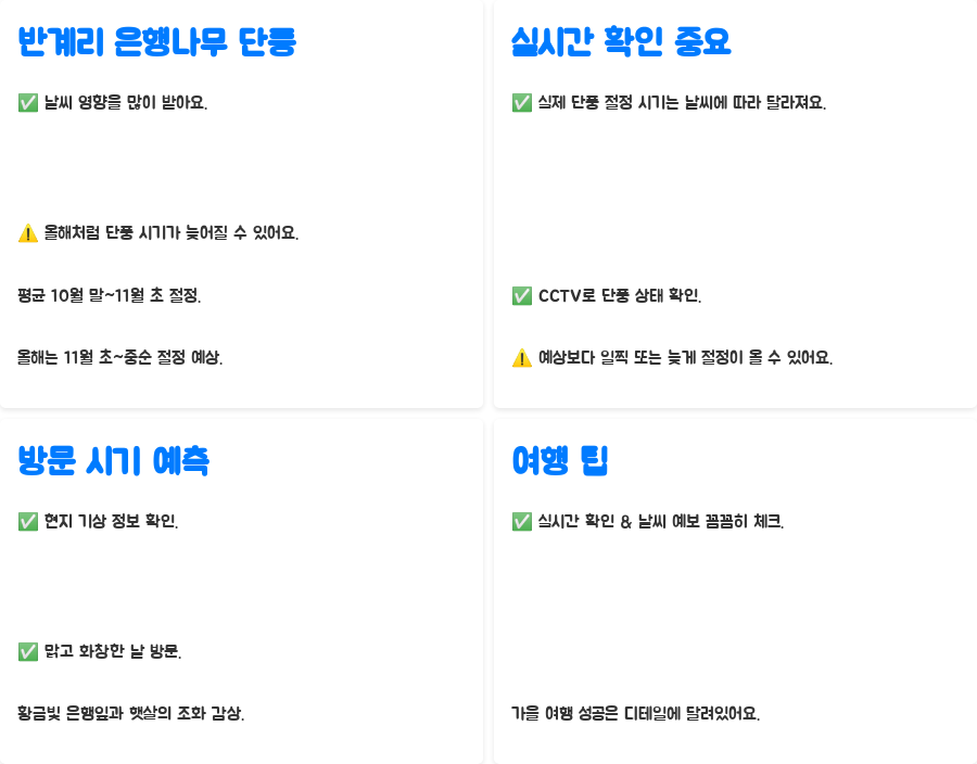 | 단풍 절정 시기 예상 | 11월 초~중순 (날씨에 따라 변동 가능) |