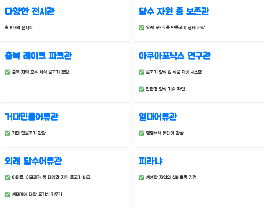 총 8개의 전시실은 각각의 매력을 뽐냅니다. 담수 자원 종 보존관에서는 우리나라 토종 민물고기들의 생태를 자세히 관찰할 수 있고, 충북 레이크 파크관에서는 충북 지역의 아름다운 호수에 서식하는 다양한 물고기를 만나볼 수 있습니다.