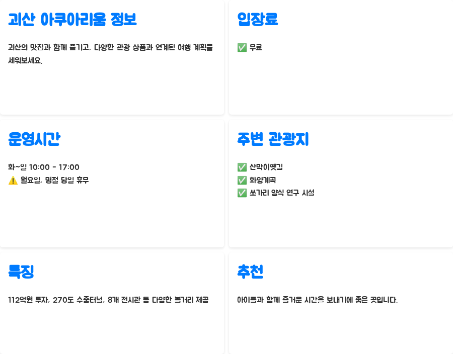 오늘 알아본 내용 어떠셨나요? 112억원의 투자로 탄생한 충북 괴산 아쿠아리움은 무료 입장이라는 파격적인 정책과 270도 수중터널, 8개의 다양한 전시관 등 볼거리와 즐길 거리가 풍성한 곳입니다. 아이들과 함께 즐거운 시간을 보내기에 더할 나위 없이 좋은 곳이니, 괴산 여행 계획이 있다면 꼭 방문해보시길 바랍니다! 다른 재미있는 여행 정보도 궁금하시다면 저희 블로그를 구독해주세요!