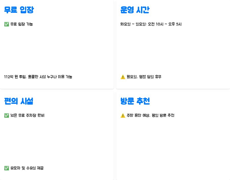 가장 놀라운 점은 바로 무료 입장이라는 사실입니다. 112억 원이라는 큰 예산이 투입된 만큼, 훌륭한 시설을 누구나 부담 없이 이용할 수 있다는 점이 매우 매력적입니다. 하지만 무료라고 해서 관람의 질이 떨어지는 것은 절대 아닙니다.