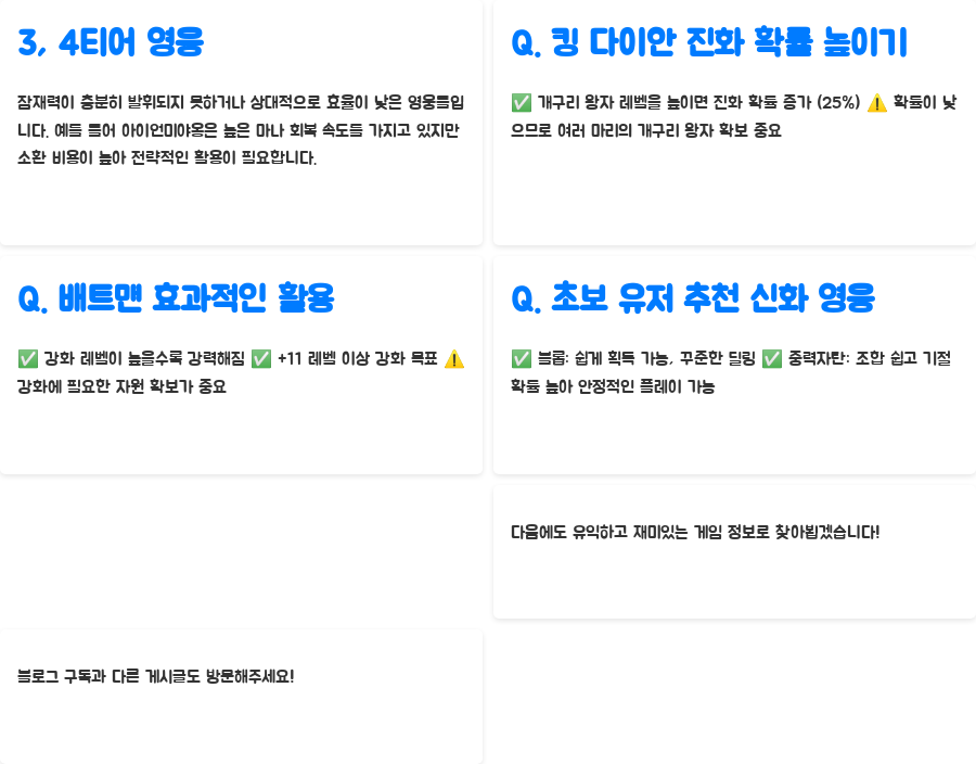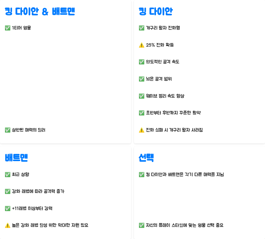 | 킹 다이안 | 1티어 | 개구리 왕자 진화형 | 높은 공격 속도와 범위 | 낮은 진화 확률 |