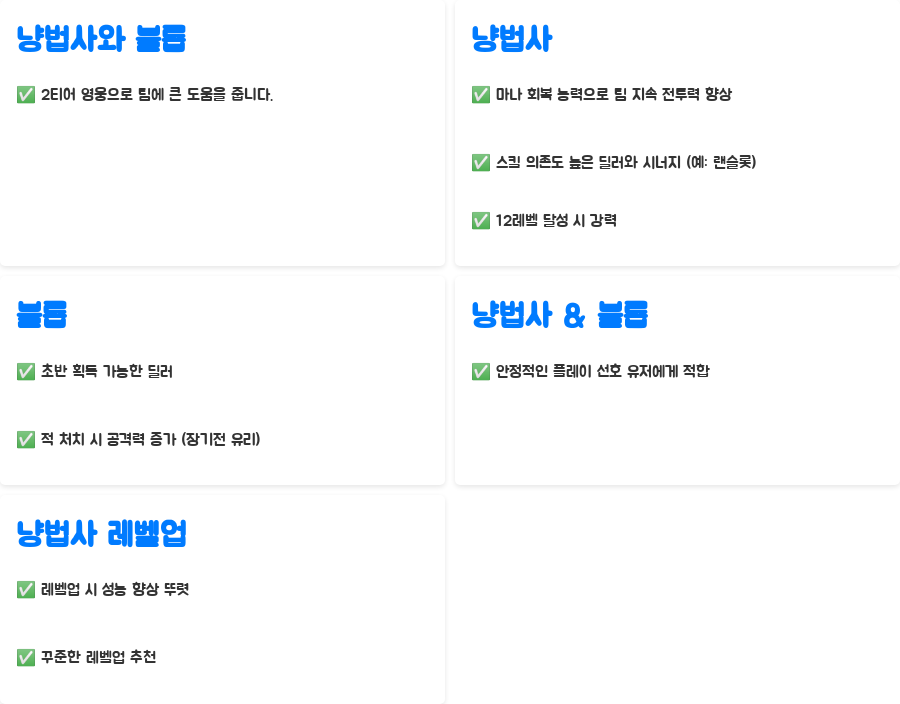 | 냥법사 | 2티어 | 마나 회복 지원 | 팀 지속 전투력 향상 | 레벨업 필요 |