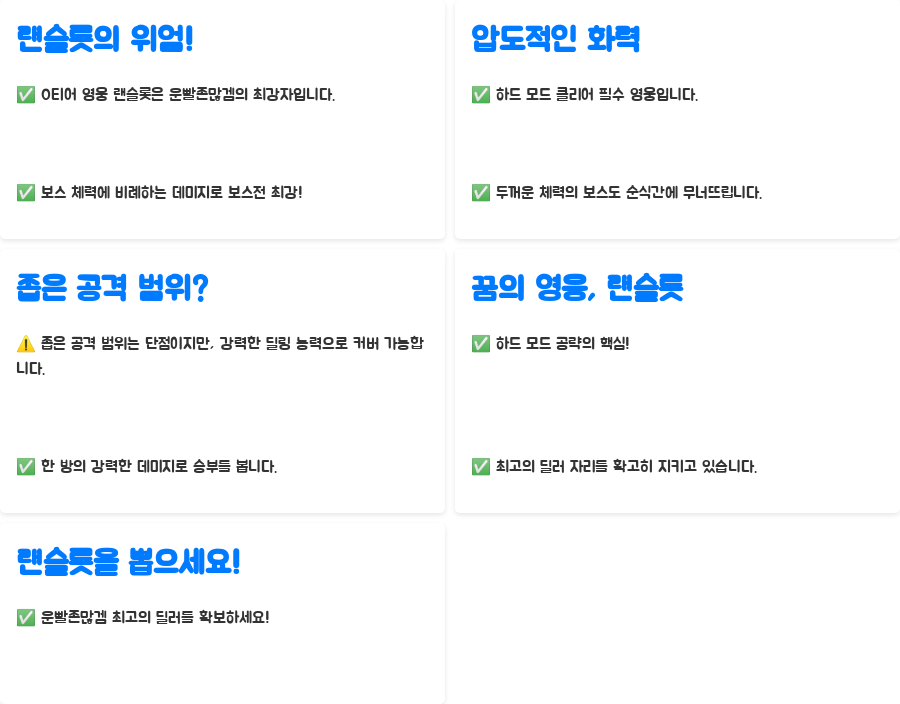 랜슬롯은 운빨존많겜에서 단연 돋보이는 0티어 영웅입니다. 적의 최대 체력에 비례하는 데미지를 입히는 그의 스킬은, 보스전에서 그 진가를 발휘합니다. 두꺼운 체력을 가진 보스도 순식간에 무너뜨리는 압도적인 화력은, 하드 모드 클리어를 위한 필수 조건이라고 해도 과언이 아닙니다.