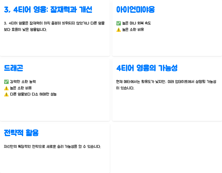 3, 4티어 영웅들은 아직 잠재력이 충분히 발휘되지 못한 영웅들 혹은 다른 영웅들에 비해 상대적으로 효율이 낮은 영웅들입니다. 아이언미야옹은 높은 마나 회복 속도를 가지고 있지만, 소환 비용이 너무 높아 전략적인 활용이 필요합니다.